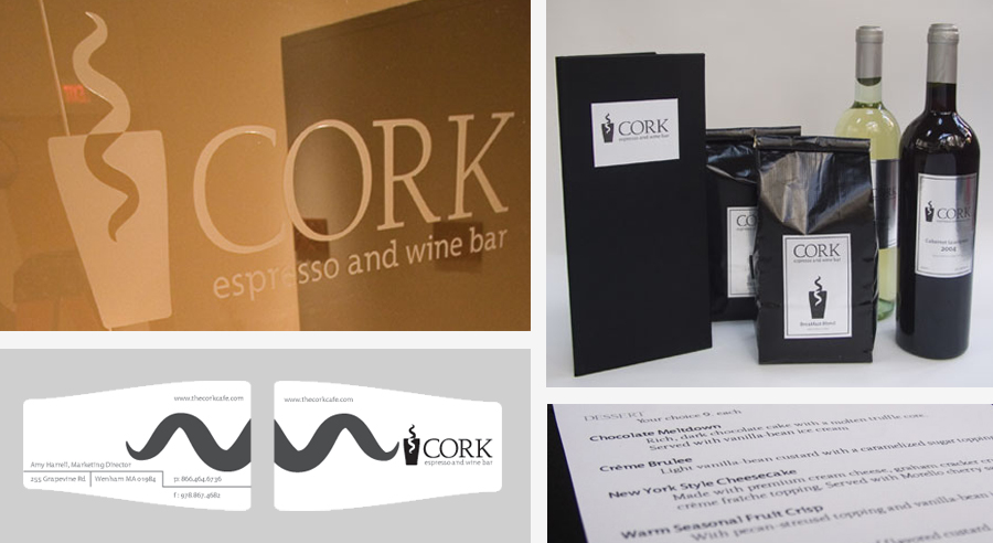 Building a brand for Cork begin with a logo that would describe the two primary services—coffee and wine—and speak to their high-end business clientel